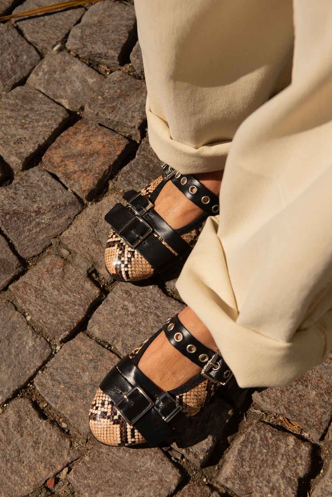 Ballerina in stampa pitonata con chiusura regolabile punta rotonda e cinghietti decorativi