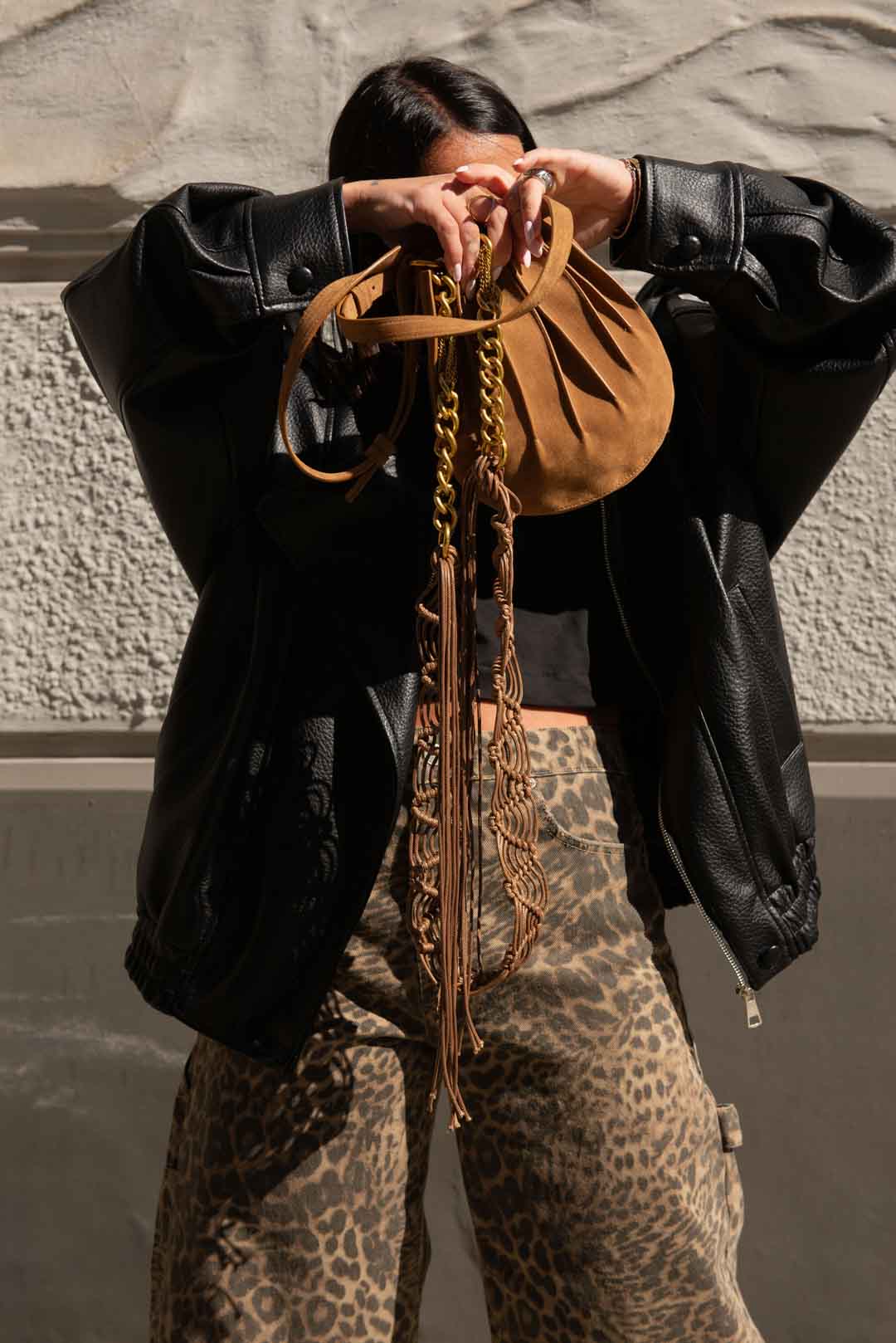 Borsa scamosciata in ecopelle a secchiello con doppia tracolla