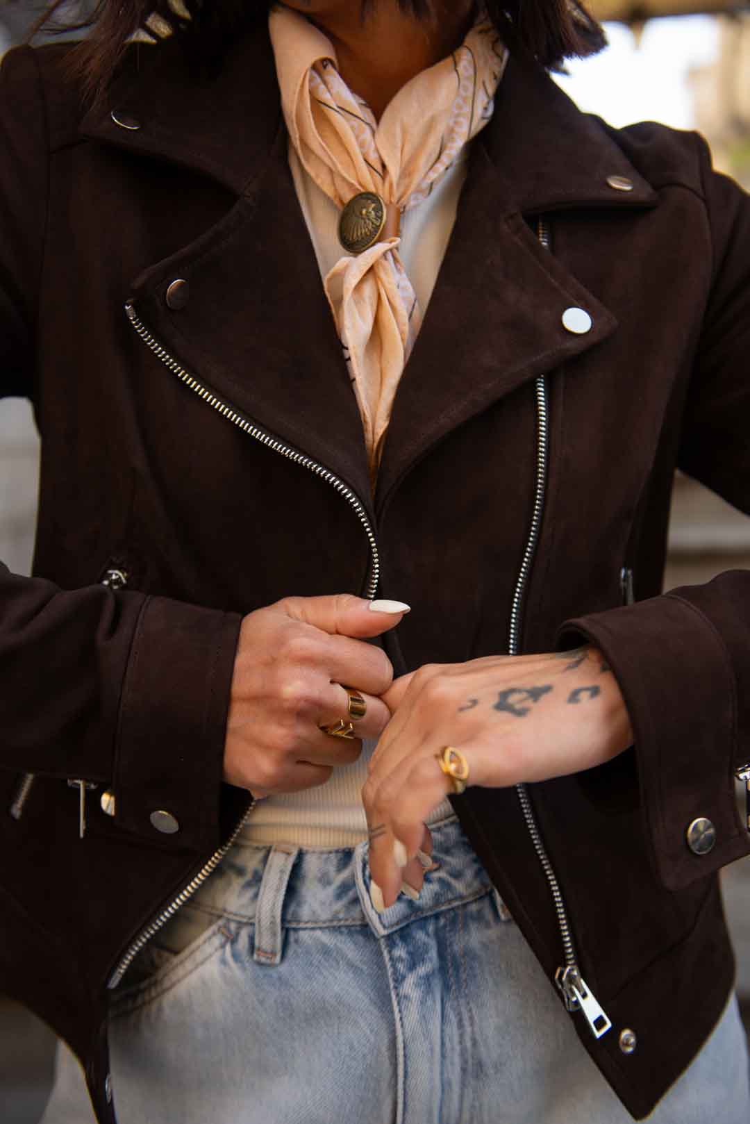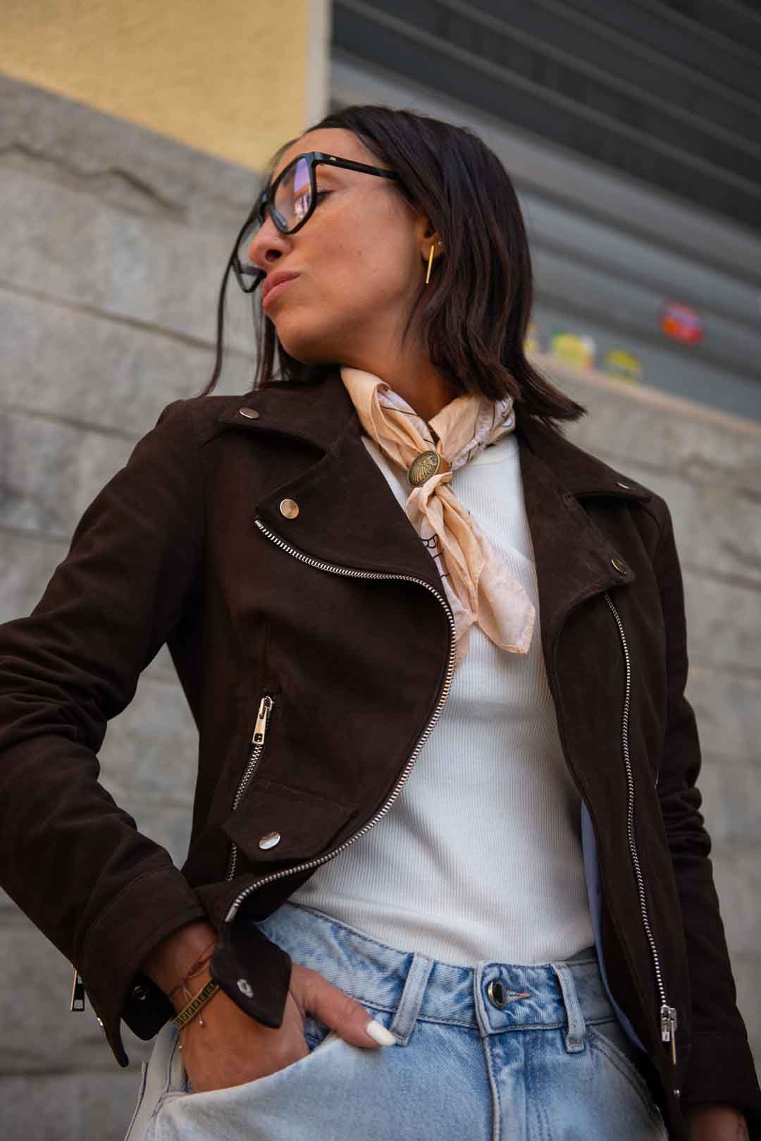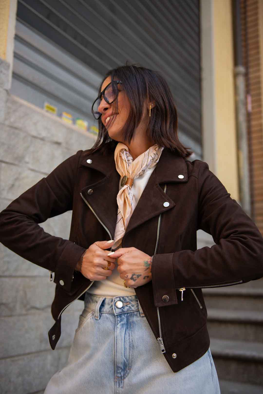 Chiodo in vera pelle scamosciata, con fodera interna in cotone zip e bottoni silver col. testa di moro vestibilità aderente