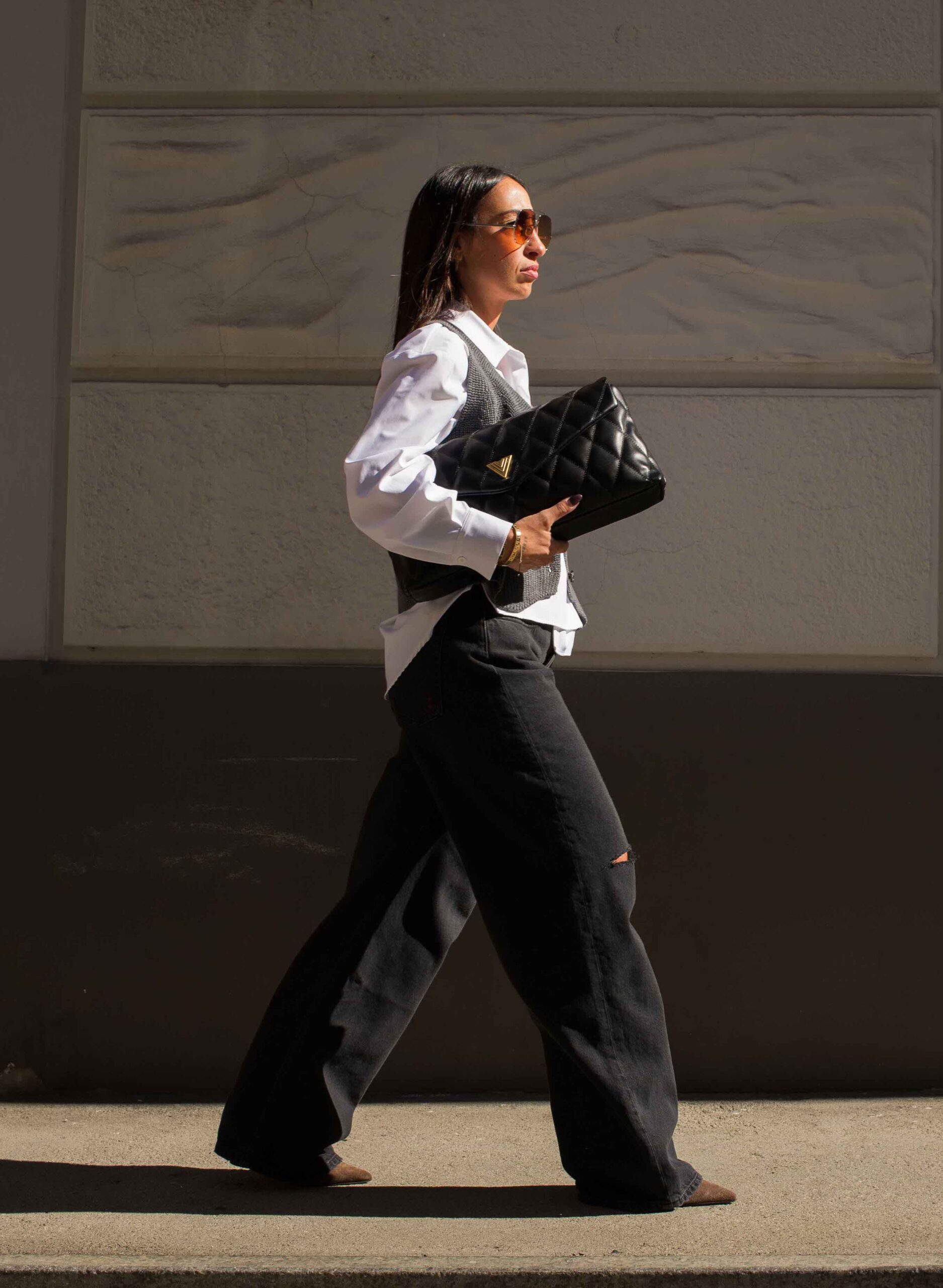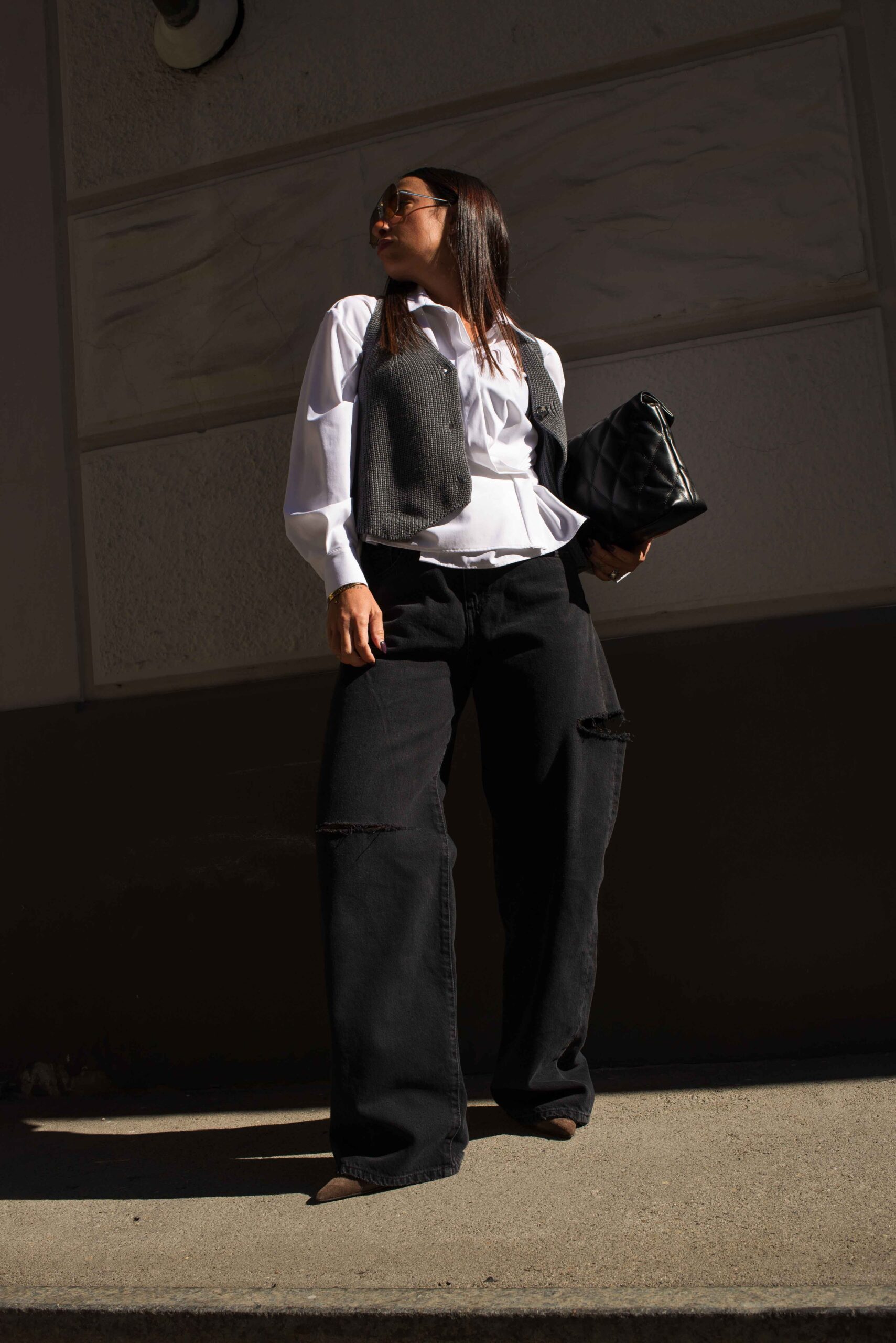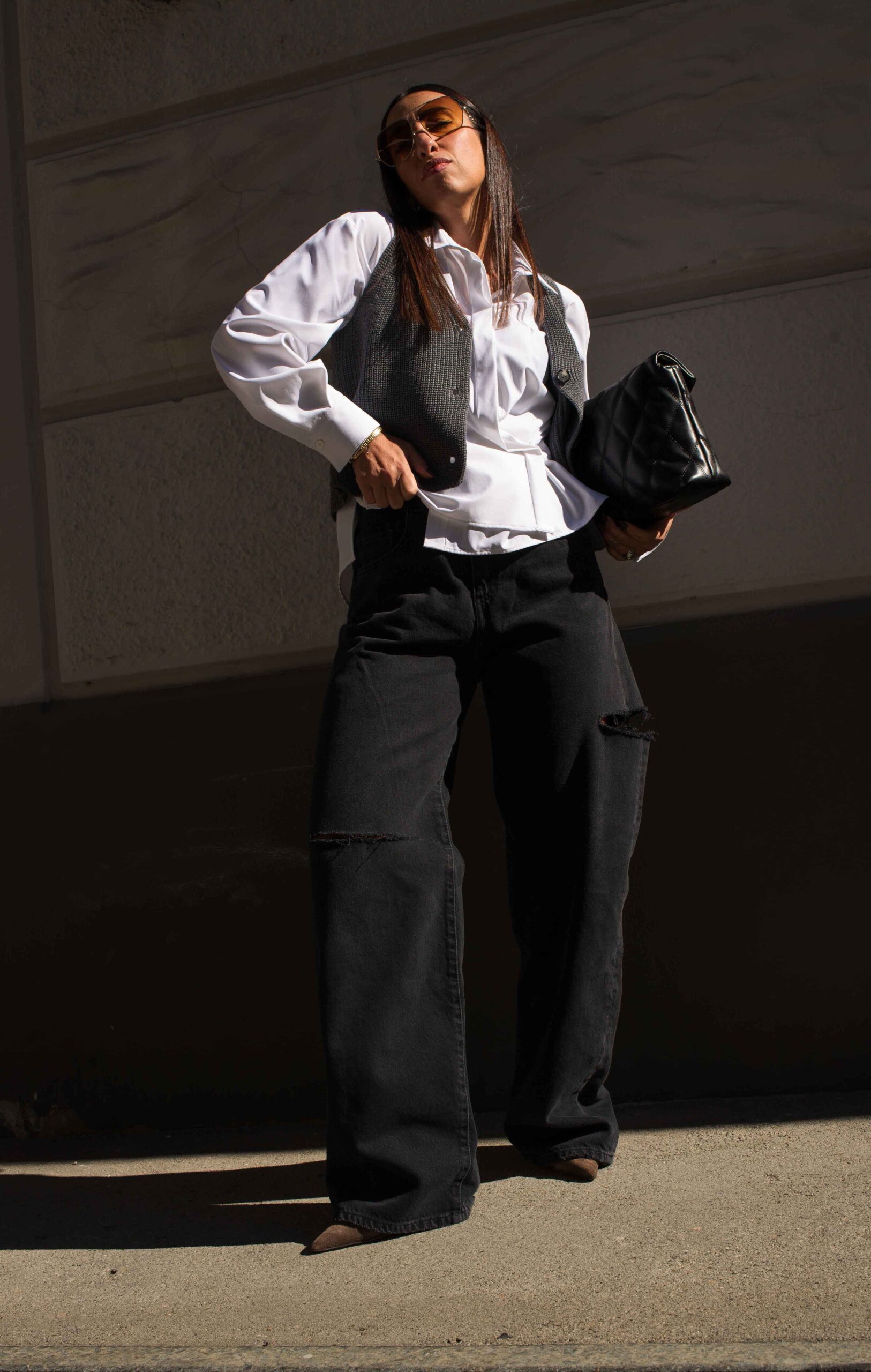 Jeans Poppy, 100% cotone, tela ferma, vita alta con dettaglio rotture in entrambe le gambe colore: graphite-black wide leg fit