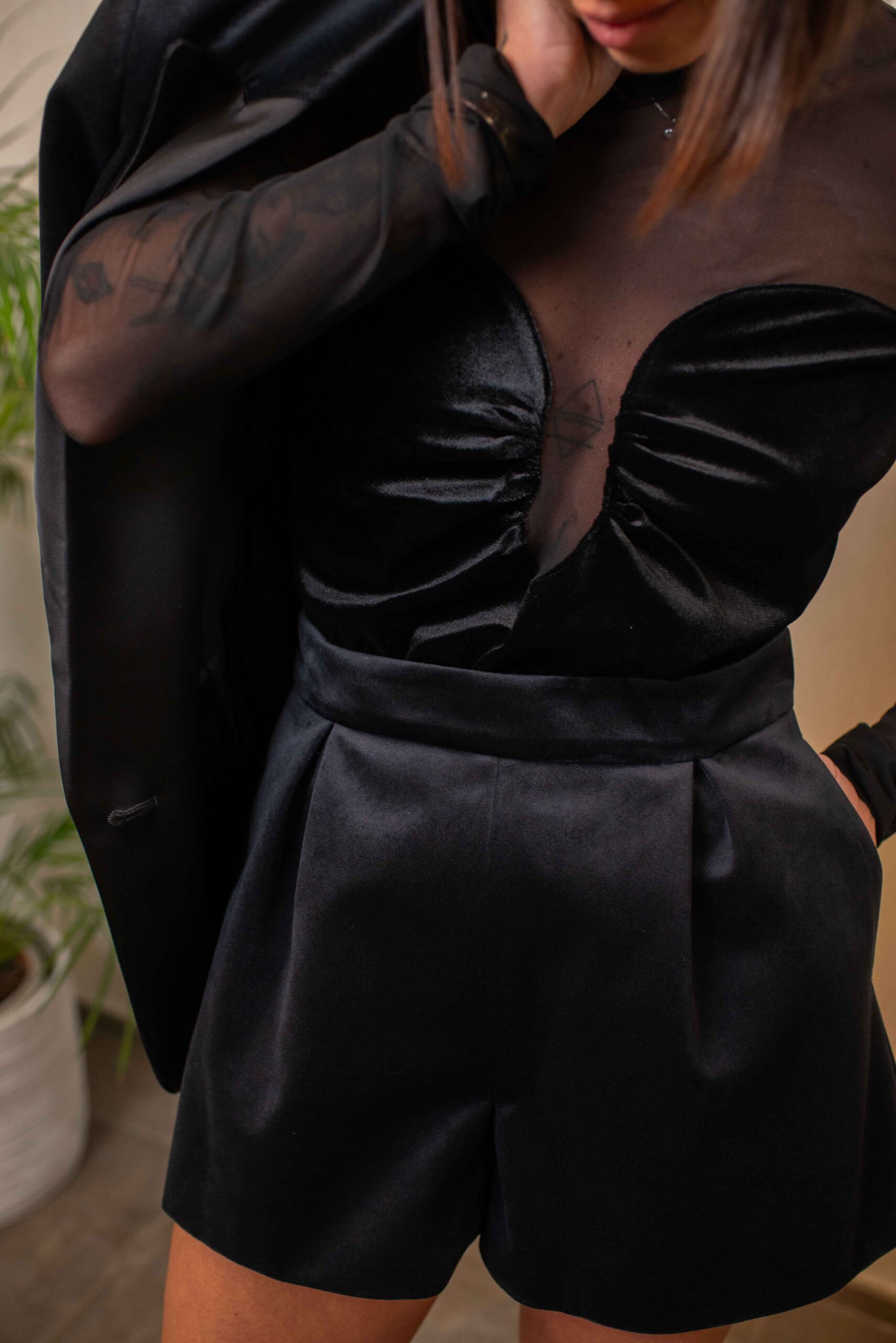 Short in velluto nero con zip posteriore, foderato all’interno, con tasche