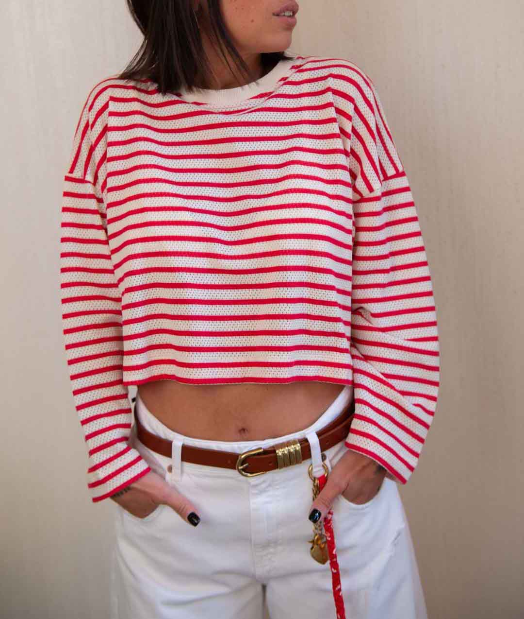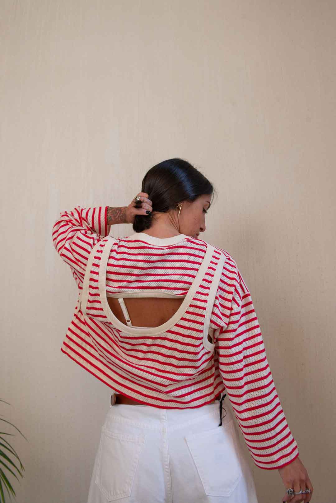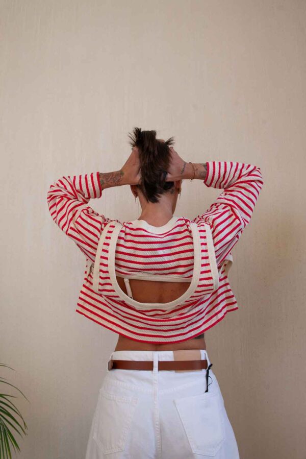 T-shirt forata in 100% cotone, riga orizzontale, manica 3/4 morbida, dettaglio apertura sulla schiena