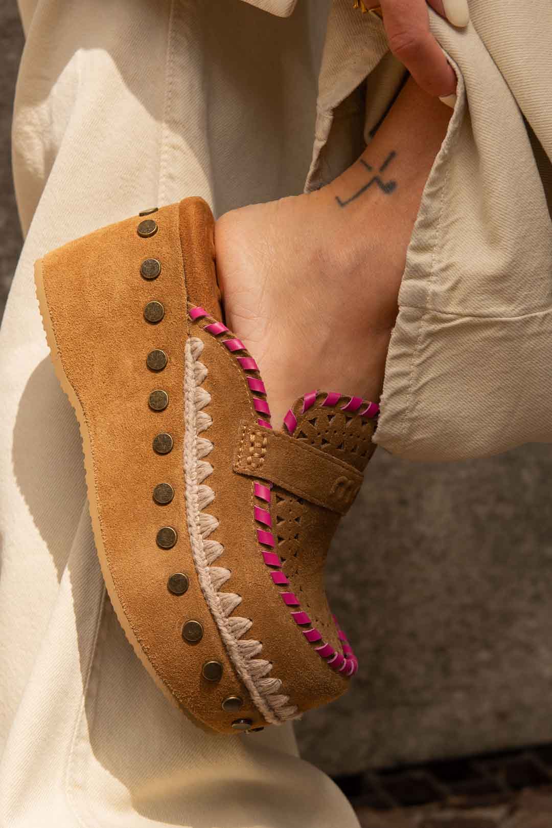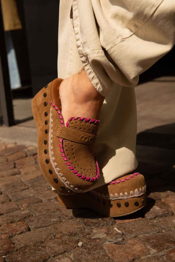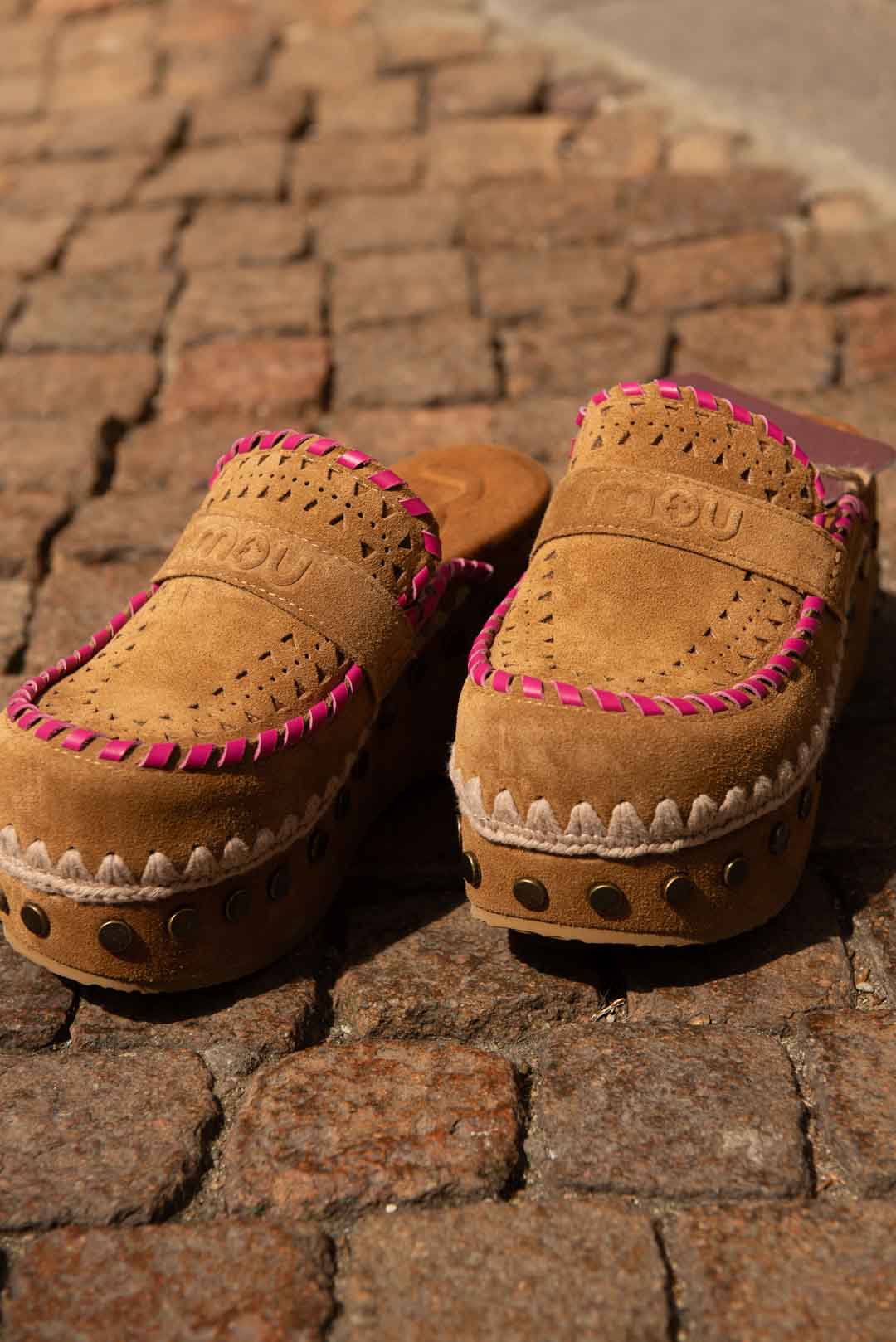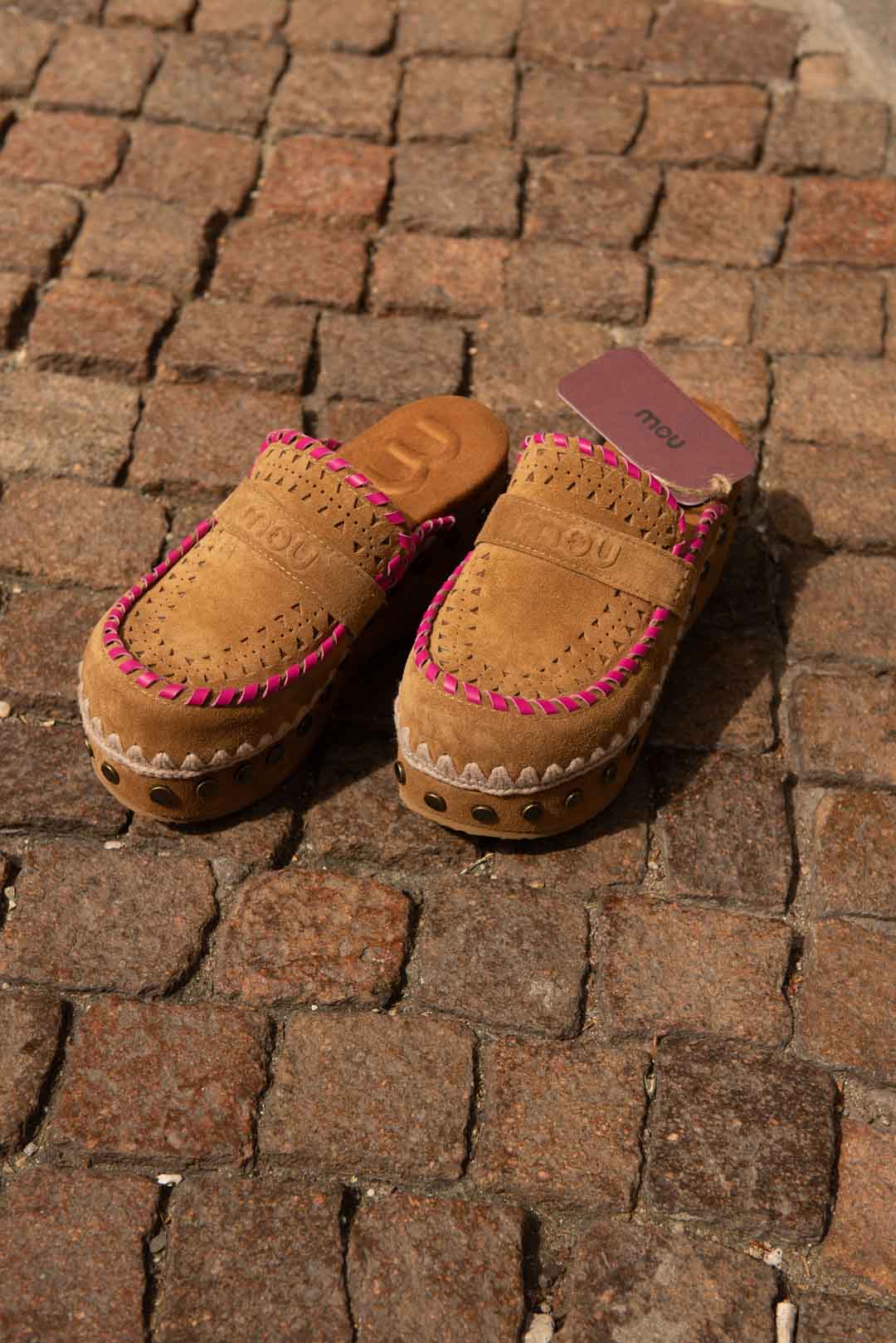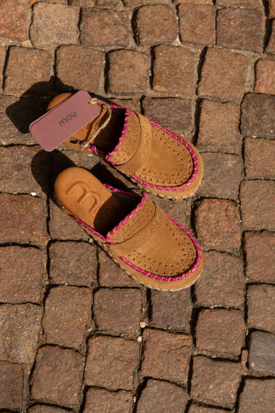 Zoccolo in vera pelle scamosciata, soletta incorporata antiscivolo, dettagli ricamati in fucsia
