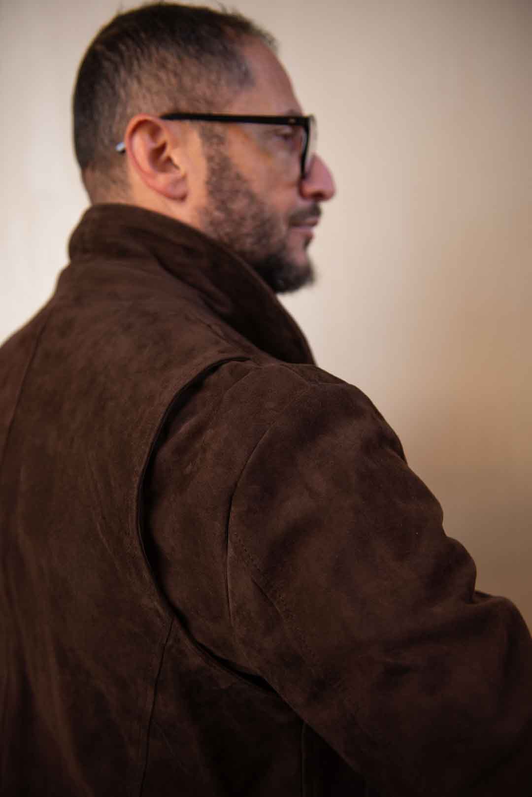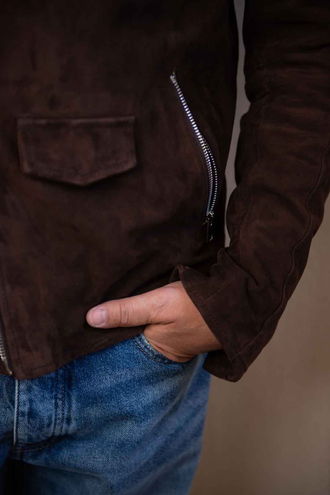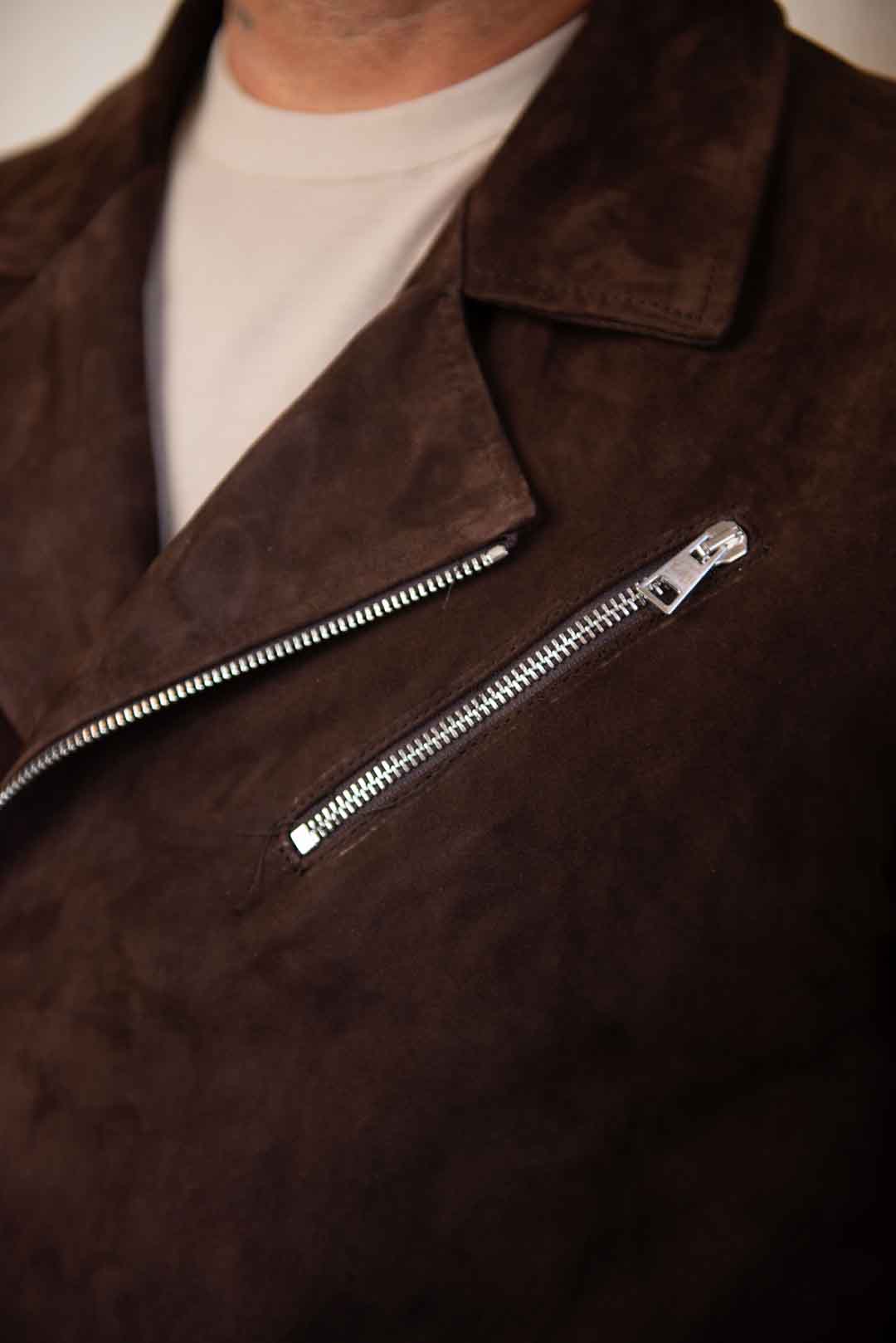 Chiodo in vera pelle scamosciata, con interno foderato in lino con zip doppio cursore, tasche con chiusura zip col. moro art. MT04