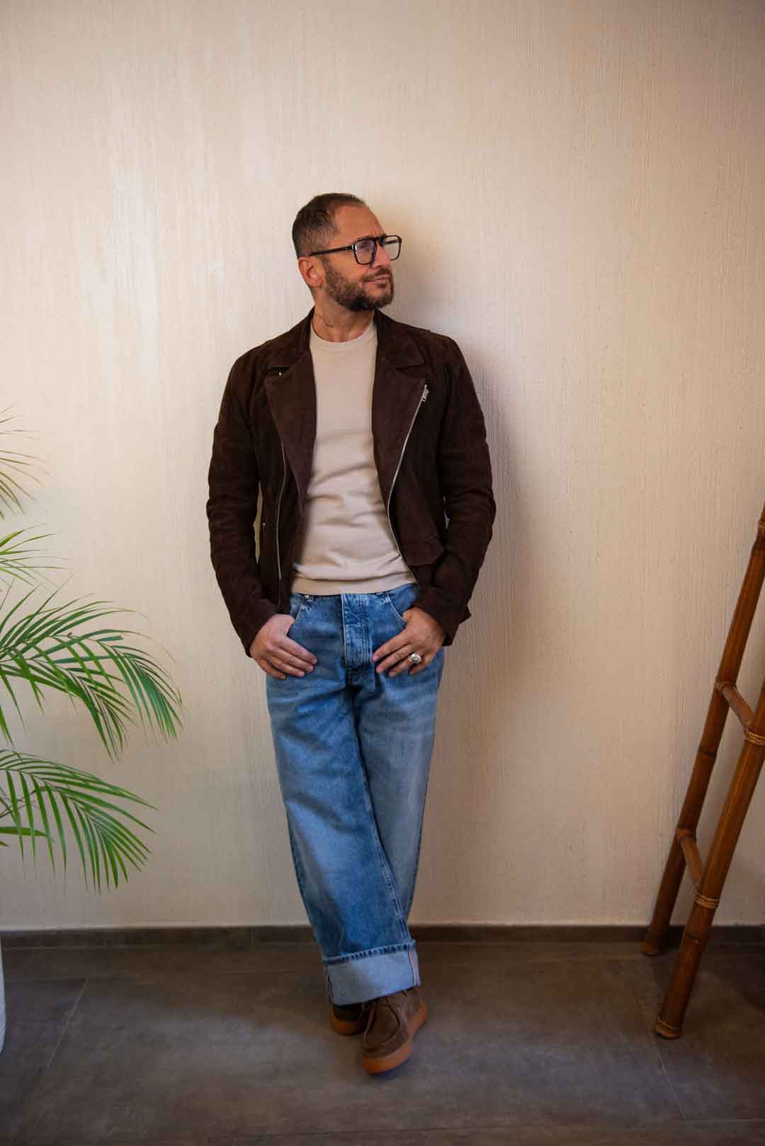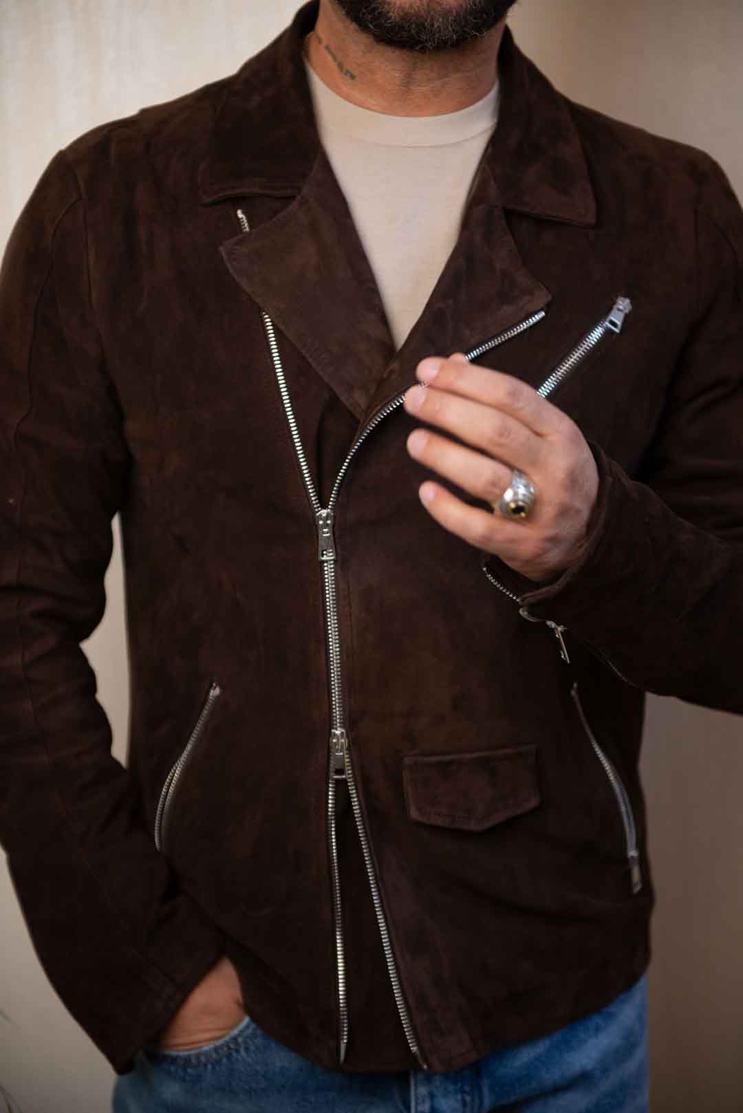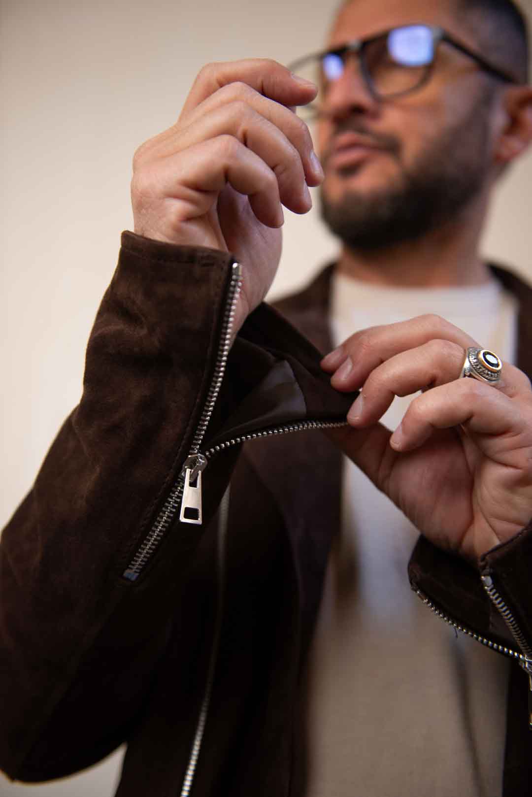 Chiodo in vera pelle scamosciata, con interno foderato in lino con zip doppio cursore, tasche con chiusura zip col. moro art. MT04